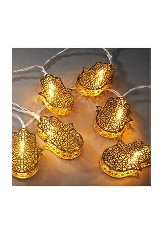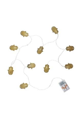 Schutz, Kraft, Glück: Bei der Fatima LED Lichterkette liegt die symbolische Bedeutung auf der Hand. Hinter 10 Ornament-geschmückten Händen in Gold verbergen sich Lichter, die das Metall warm erstrahlen lassen. Das macht die 165 cm lange, batteriebetriebene Lichterkette zu einem sommerlichen Hingucker, der insbesondere mit den Boho-, Asia- und Oriental-Stil harmoniert.