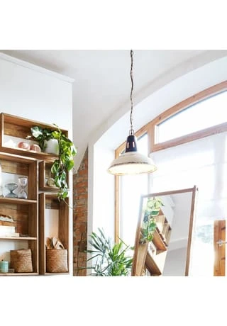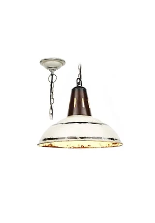Im Stil antiker Fabriklampen gefertigt steht hier die Funktion im Vordergrund. Holen Sie sich ein ausgefallenes Wohnaccessoire nach Hause! Hängelampe mit antikweißem Finish im Shabby-Look. Ausgefallen, aber nicht exzentrisch, so werden Ihre Besucher diese Hängeleuchte vielleicht beschreiben. Egal, ob an einer hohen Decke in einer Altbauwohnung, in einem großflächigen Loft oder sogar im Treppenhaus, diese Lampe aus lakiertem Eisen im gewollten Used-Look rundet jedes Ambiente ab und passt sich dank der kürzbaren Metallkette allen Gegebenheiten problemlos an. Denn wegen des zurückhaltenenden Designs verträgt sie sich mit einer Einrichtung im Industrial-Chic ebenso wie mit dem Retro-Stil. Wenn Sie einen besonderen Kontrast setzen wollen, kombinieren Sie die Lampe doch einfach mit einer Einrichtung im Kolonial-Stil. Erlaubt ist, was gefällt. Eins ist aber sicher: diese Lampe verleiht jedem Raum das gewisse Etwas und wird mit der Zeit sogar noch schöner!