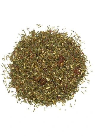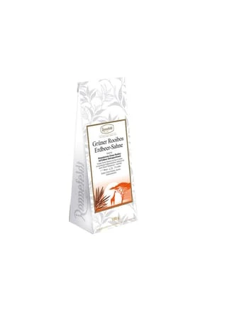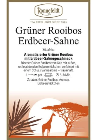 Frischer, grüner Rooibos vom Kap mit süßen, rot leuchtenden Erdbeerstückchen auf einem Schuss Sahne – traumhaft.