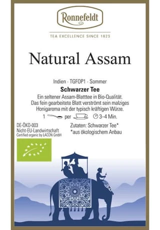 Blattgrad: TGFOP1 Ernte: Sommer Ein seltener Assam-Blatttee in Bio-Qualität. Das fein gearbeitete Blatt verströmt sein malziges Honigaroma mit der typisch kräftigen Würze. Kontrollstelle:DE-ÖKO-037